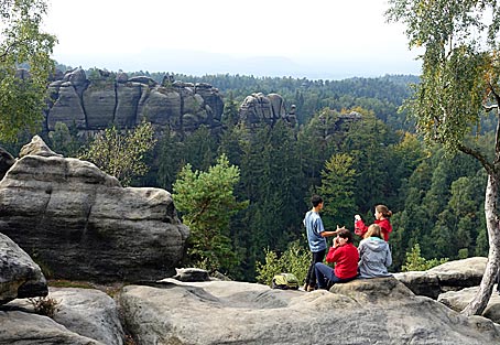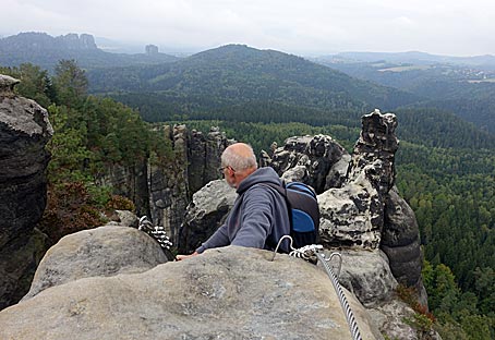 Nach dem interessanten Aufstieg kann man eine prächtige Aussicht zu den Schrammsteinen, dem Falkenstein und der Hohen Liebe genießen.