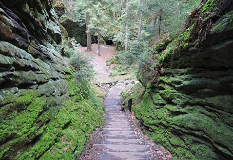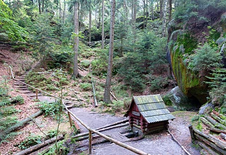 Über Holzstufen ging es hinab in einen moos- und farnbewachsenen Felskessel, Vorbei an der überdachten Quelle des Friensteinflössels |
