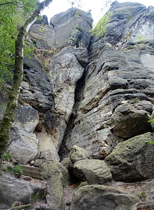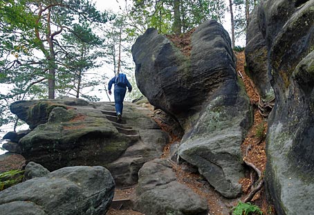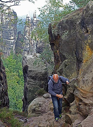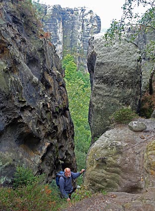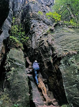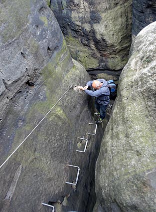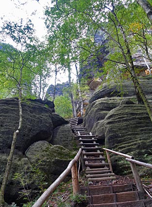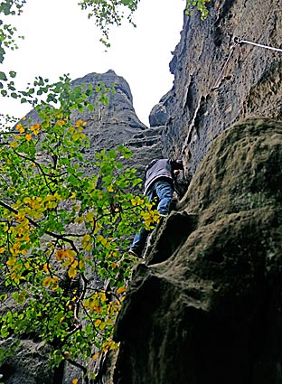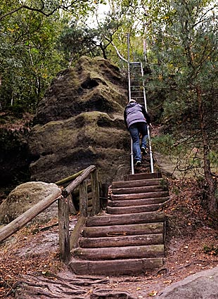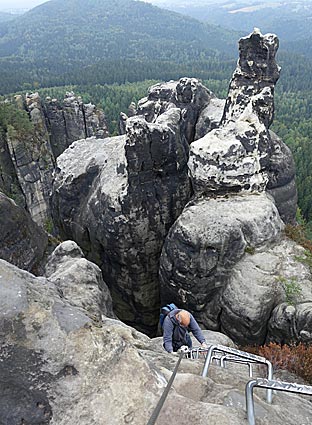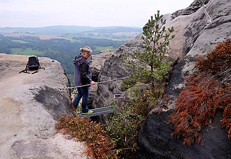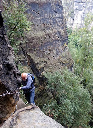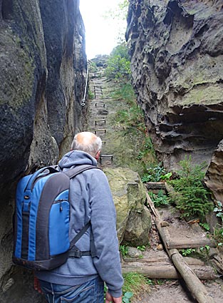 Nachdem der untere Teil der Häntzschelstiege überwunden ist, Über Eisenleitern und Stufen geht es dann hinauf auf die Obere Affensteinpromenade, |