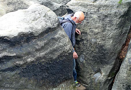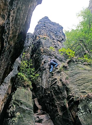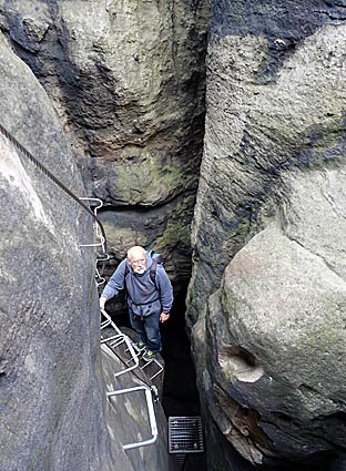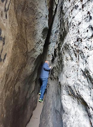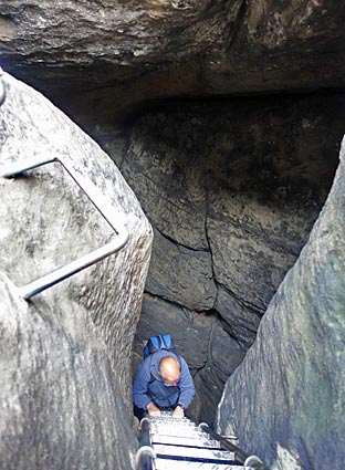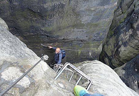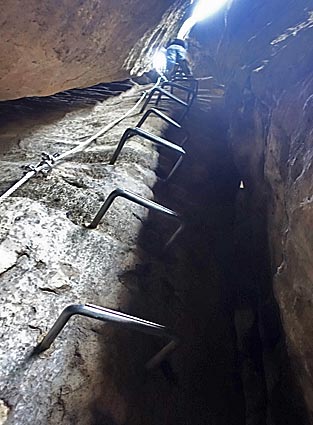 Dann geht es über eine fast senkrechte Eisenleiter vom Felsinnern in eine Kluft.