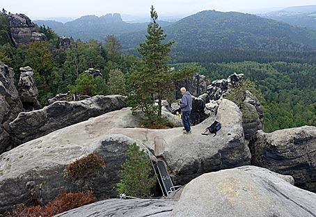 und über Treppen, eine Holzleiter und einige Felsstufen wieder aufwärts ging, erreichten wir das Gipfelplateau des Carolafelsens.