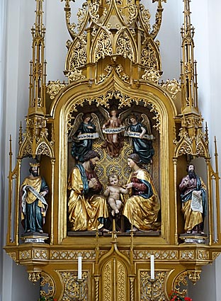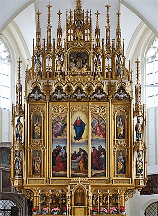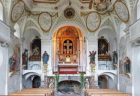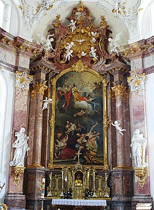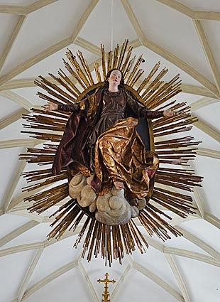 Der Hochaltar wurde 1611 geschnitzt. Eine in den Himmel erhobene Muttergottes im Strahlenkranz hängt im Chorbogen.