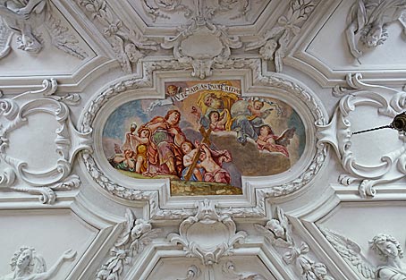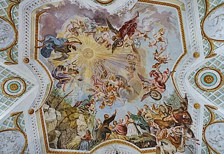 rechts: das Deckenfresko in der Anastasiakapelle zeigt Dreifaltigkeit, Maria, Märtyrerpalme und Engelschöre