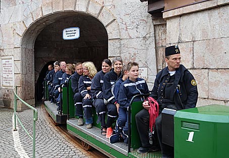 Highlights waren die lange rasante Fahrt mit der Grubenbahn tief in den Berg hinein, die Bergmannsrutschen und die Fahrt über den unterirdischen Salzsee.