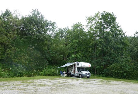 Ein Stellplatz in himmlischer Ruhe. Auch hier regnete es wieder, wie an jedem Spätnachmittag. Dank Markise konnten wir trotzdem draußen sitzen.