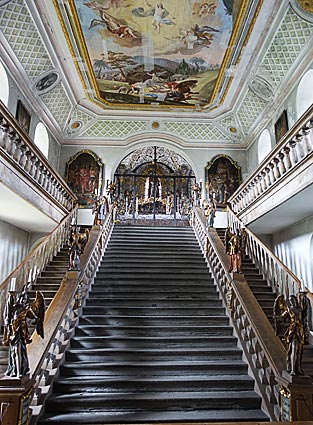 < Im ältesten Teil der Kirchenanlage führt die Heilige Stiege zu einem weiteren Altar hinauf. |
