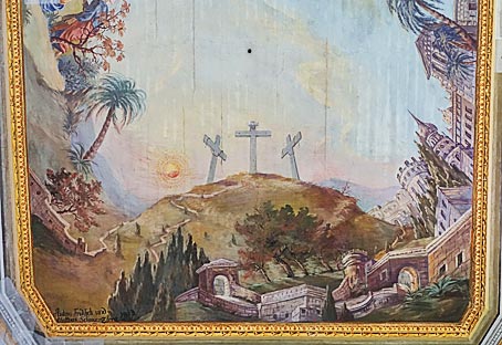 Das Chorfresko wurde 1880 erneuert und zeigt die Früchte des Kreuzopfers: