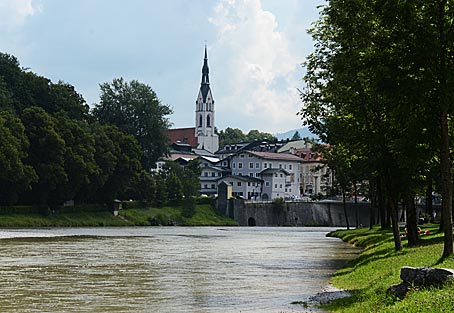 Der Wohnmobilhafen von Bad Tölz liegt direkt an der Isar. Auf dem Uferweg ist der Ortskern schnell erreicht.
