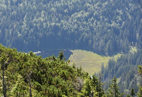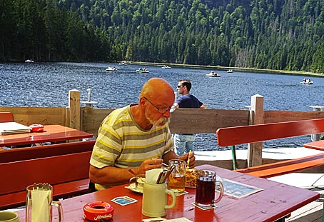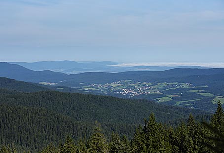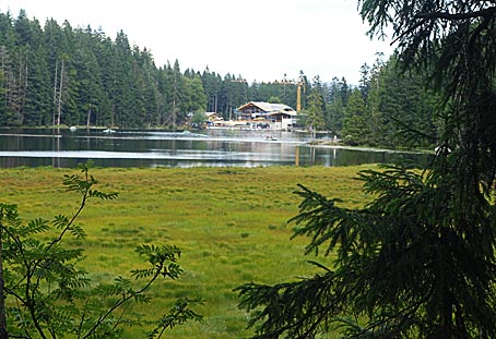 Vor dem Rundgang um den See war erst mal ein Mittagessen Blick von der Terasse zur Arberwand > |