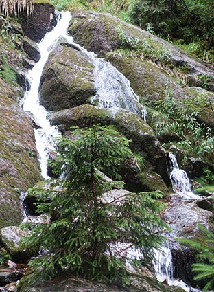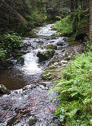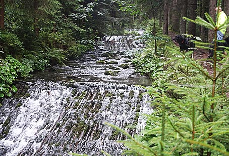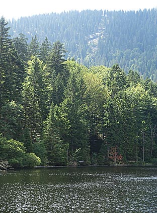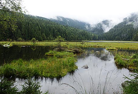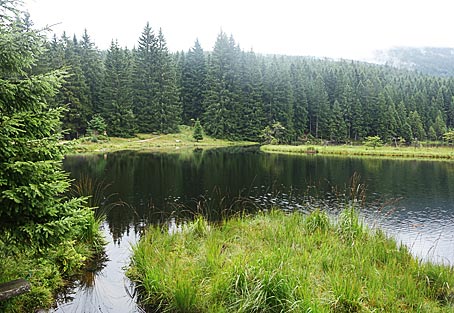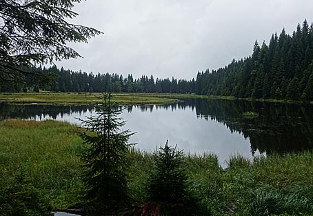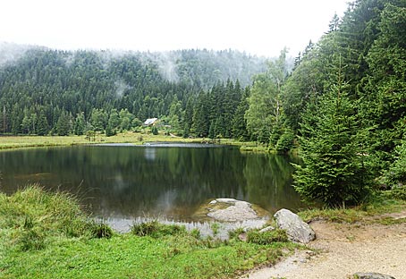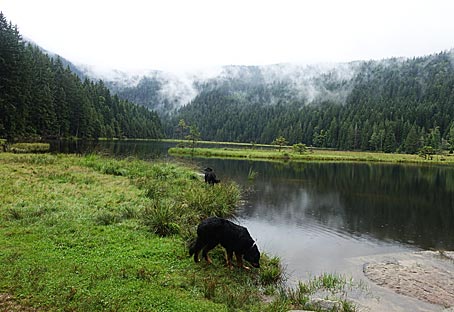 Als wir an dem idyllischen Bergsee auf 918 m über NN ankamen, ließ der Regen langsam nach.