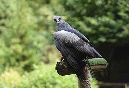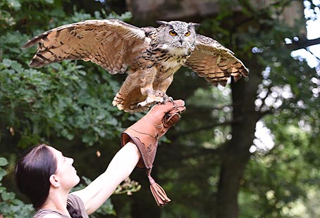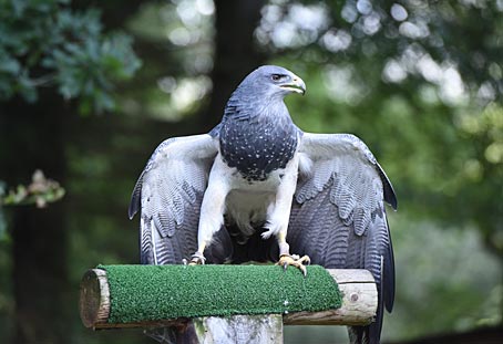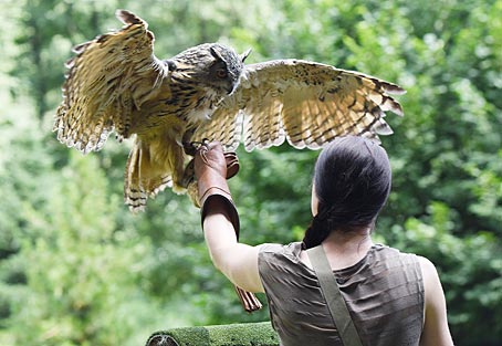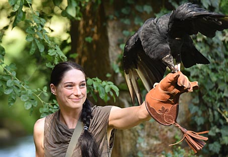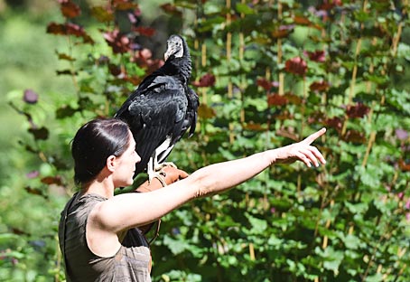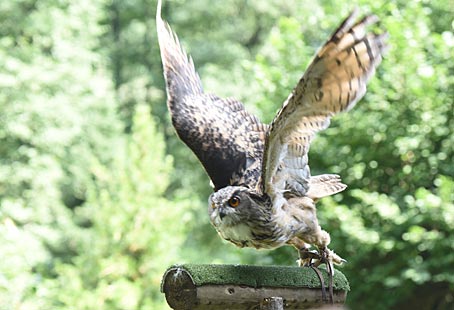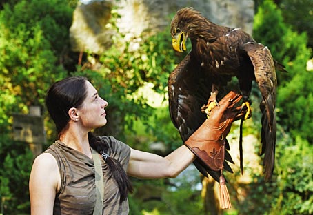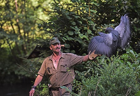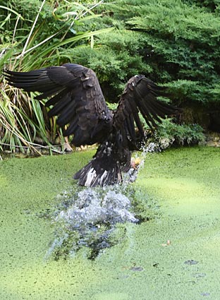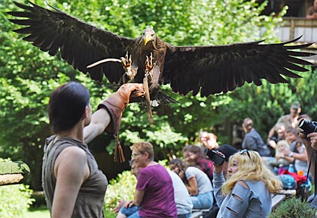 < Der Seeadler fing seine Beute auch in einem kleinen Teich. Zum Schluss der Show wurde ein besonders gefährlicher Vogel angekündigt, |