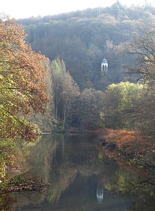 Pavillion und Fontäne an den Mühlenteichen — Von Holsteins Mühle führt eine Eichenallee in Richtung Bröl und Schlossberg.