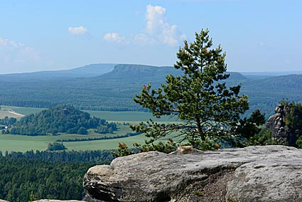 Auf dem rechten Bild schaut man über die Ebenheit bei Schöna mit der Kaiserkrone zum Großen Zschirnstein, dahinter der Hohe Schneeberg.