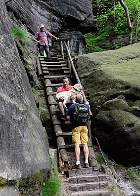 Auch auf dem schmalen Schrammsteinrücken gab es immer wieder Leitern und sehr steile Treppen hinab. Nichts für Hunde!