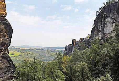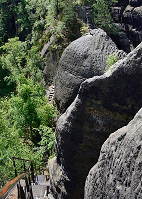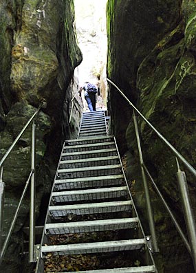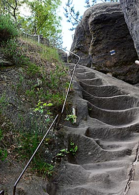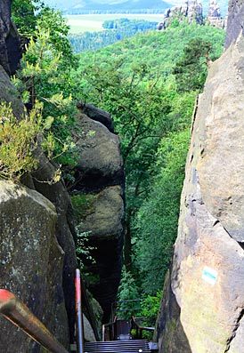 < Die alten in den Stein gehauenen Stufen sind tief ausgetreten. Blick über das Durchbruchstal der Elbe hinweg zur Schönaer Ebenheit |