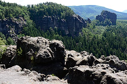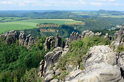 rechts: Blick über den Großen Dom mit den Sandlochwänden zu den Schrammsteinen und dem Falkenstein.