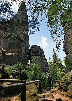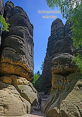 Der Weg führt zwischen dem 60 m hohen Schrammtorwächter und den glatten Ostertürmen