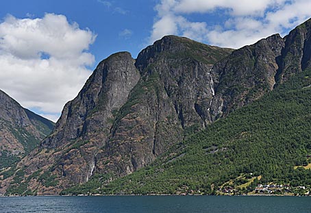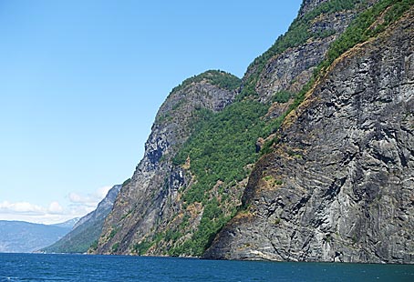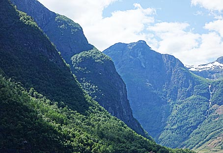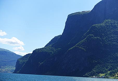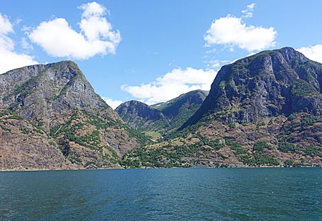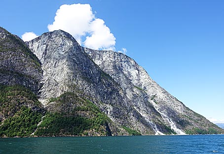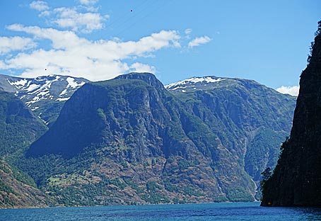 Die Berge am Næroyfjord ragen bis zu 1.400 m hoch schroff nach oben.