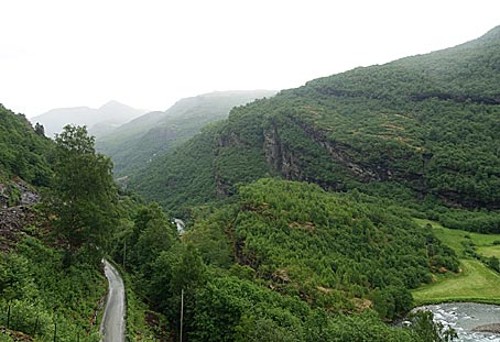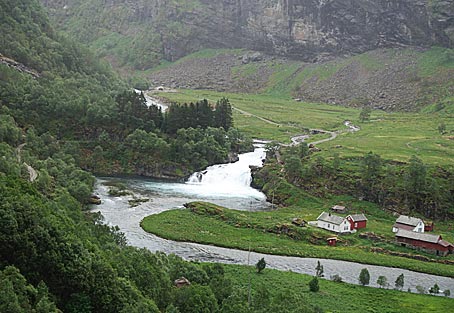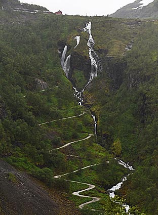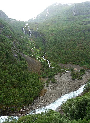 < Für Wanderer führt der "Rallarvegen" von Myrdal aus in Serpentinen steil hinunter. |