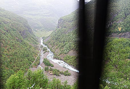 Am nächsten Tag stand bei leichtem Nieselregen eine Fahrt mit der Flåmsbahn an. Der Nieselregen setzte wie vorhergesagt pünktlich um 7 Uhr ein. Der erste Zug fuhr am Bahnhof in Flåm um 7h30 ab und wir hofften, dass die Sicht noch nicht gar so schlecht ist. Zumindest saßen wir im Zug trocken.