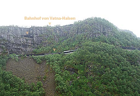 Zwischen dem Wasserfall und dem Bahnhof von Vatna-Halsen muss die Flåmsbahn auf 3 km 150 Höhenmeter überwinden.