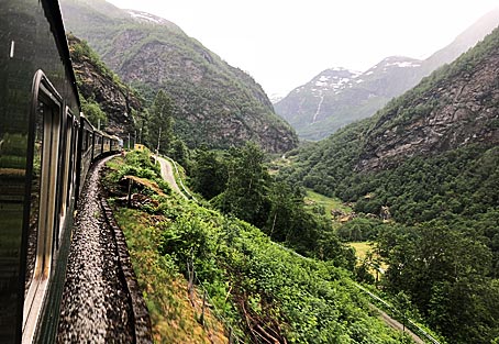 Die 1935 - 1938 gebaute Flåmsbana war ursprünglich ein unerlässliches Transportmittel für das abgeschnittene Tal. Das Besondere an der Flåmsbahn sind hauptsächlich die technischen Details bzw. die damalige enorme Herausforderung für die Eisenbahningenieure. Flåmsbana ist eine der spektakulärsten Zugstrecken der Welt. 17 Jahre dauerten die Arbeiten für die steilste Adhäsionsbahn, die ohne Zahnradantrieb auf Normalspur verläuft. Die Gleise mussten in starkem Gefälle und in scharfen Kurven verlegt werden, damit sich die Züge die steilen Abhänge hoch- und hinunterschlängeln können. Fast 80 % der Bahngleise haben ein Gefälle von 1 m je 18 m Länge, die größte Steigung dieser Strecke beträgt 5 %. Die senkrecht aufragende Gebirgswand im oberen Teil des Tals war für die Ingenieure eine enorme Herausforderung. Um den Höhenunterschied zu überwinden, bohrten Arbeiter im Berginneren einen Wendetunnel. Auf vier übereinanderliegenden Etagen schraubt sich der Zug von Meereshöhe bis auf 866 Meter ins Bergdorf Myrdal hinauf. Hunderte Arbeiter meißelten die Trasse aus fast senkrechten Wänden. Der Zug fährt durch 20 Tunnel mit einer Gesamtlänge von 6 Kilometern. Von diesen wurden 18 Tunnel von Wanderarbeitern von Hand durch das Bergmassiv getrieben. Jeder Meter bedeutete einen Monat harte Arbeit. Heute unvorstellbar.