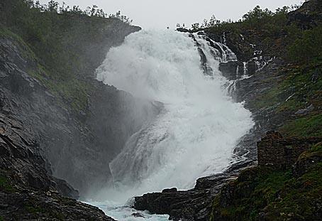 Die ganze Umgebung des Kjossfossen ist von feinem Sprühnebel erfüllt. |