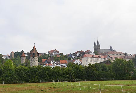 Unser Stellplatz in der Ederaue (51.124305, 9.266084) — Blick von der Ederniederung auf Fritzlar mit Dom und den Wehrtürmen der Stadtmauer