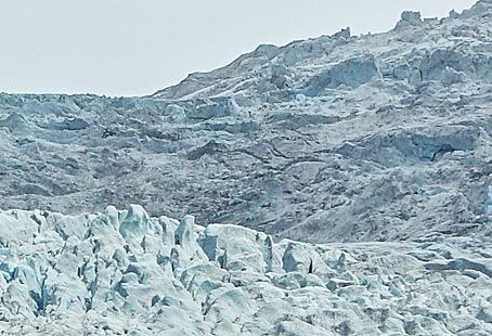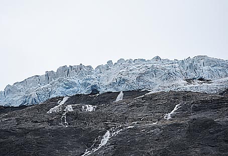 An mehreren Stellen quillt der Gletscher über den Berg und Tauwasserbäche stürzen zu Tal.