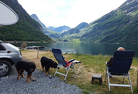 Von der Aussichtsplattform sind wir wieder runtergefahren zu unserem Stellplatz (62.114932N, 7.184541E) direkt am Fjord
