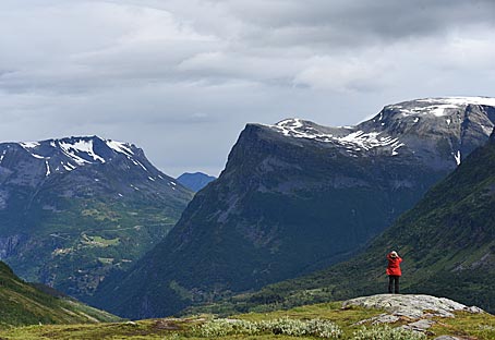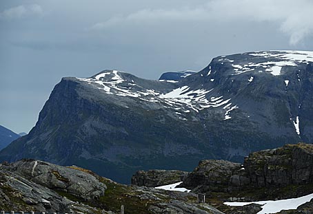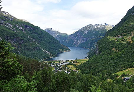Aussicht von Ornesvingen in Richtung Geiranger und den dahinter liegenden 1500 m hohen Berg Dalsnibba (links)