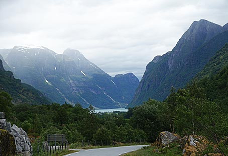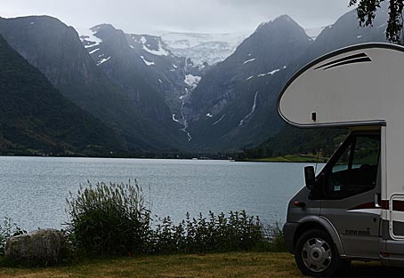 Übernachtet haben wir auf dem Olden Camping Gytri (61.739103N, 6.790553E) direkt am tiefgrünen Gletschersee Oldevatnet mit gutem Blick auf den Briksdalsbreen. Der Gletscher ist im Oldedalen allgegenwärtig. Auch neben dem Campingplatz quillt er über den Berg.