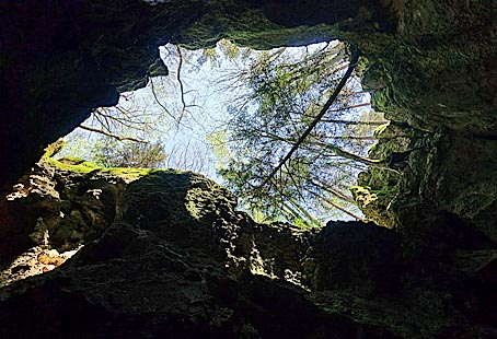 links: Blick nach oben zum Klingloch, dem Mund des 20 m tiefen Schachtes der zum Himmel geöffneten kleinen Doline.