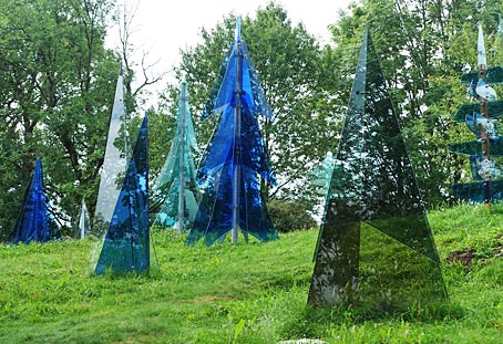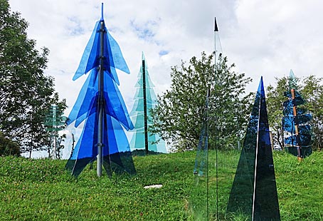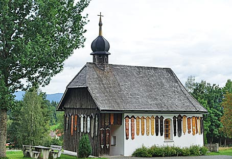 Direkt über dem Parkplatz steht ein Gläserner Wald. Kapelle mit Totenbrettern, die an Verstorbene erinnern sollen. |