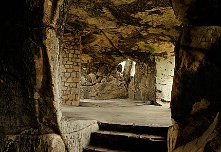 Mit seinen aus dem Sandstein herausgehauenen Kammern ist der Fels löchrig wie ein schweizer Käse.