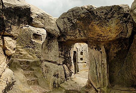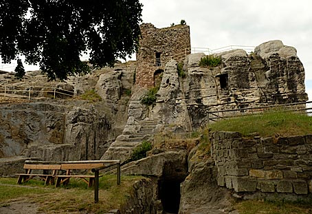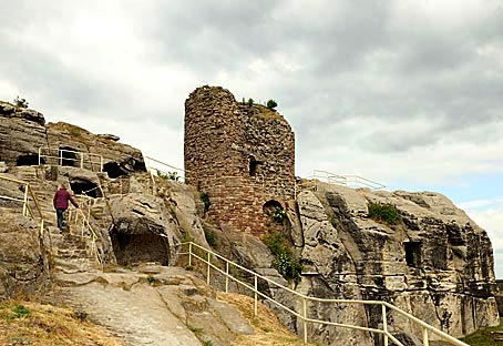 Als Besonderheit gilt die aus dem Sandstein herausgearbeitete Architektur mit ihren heute noch erhaltenen Felsräumen und Gräben.