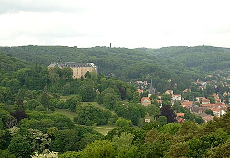 Blick vom Großvaterfelsen zum Großen Schloss (erbaut 1705-1731) mit seinem Schlosspark. |