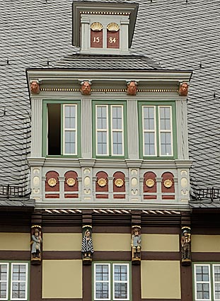 Außergewöhnlich sind die holzgeschnitzten Figuren - Heilige, Narren und Gaukler - an Stützbalken und Balkenköpfen.