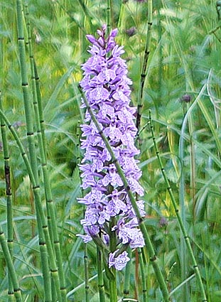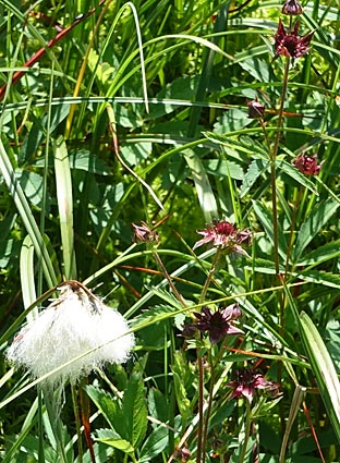 Sumpfblutauge (Potentilla palustris) - geflecktes Knabenkraut (Dactylorhiza maculata) mit Sumpf-Schachtelhalm (Equisetum palustre) - Wollgras (Eriophorum)