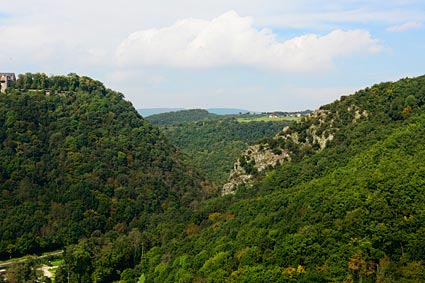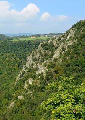 einen atemberaubenden Blick ins tief eingeschnittene Kellenbachtal und zu den schroffen Schieferfelsen.
