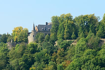 Dicht bewaldet wölbt sich der Burgberg von Schloss Dhaun ins Tal hinein.