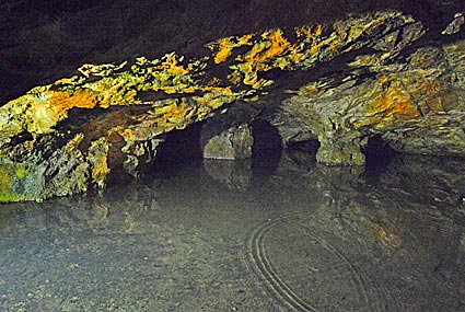Durch Spalten tropft Oberflächenwasser in den Stollen. Das Wasser ist glasklar.