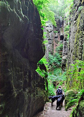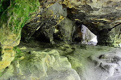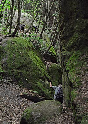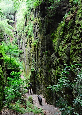 Zwischen den Felsen ist es immer kühl. Die Felswände haben beeindruckende Formen und sind mit Moos überzogen.