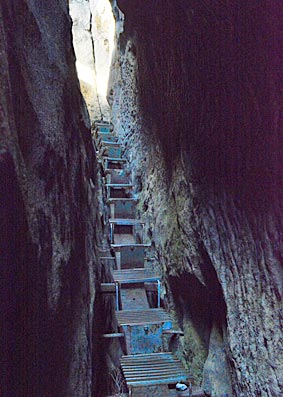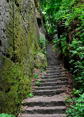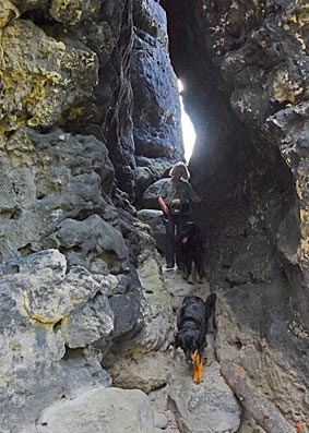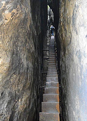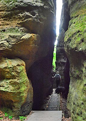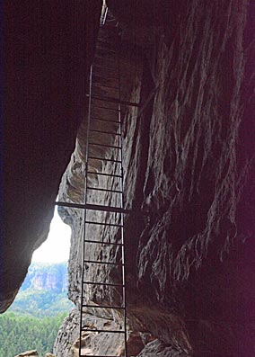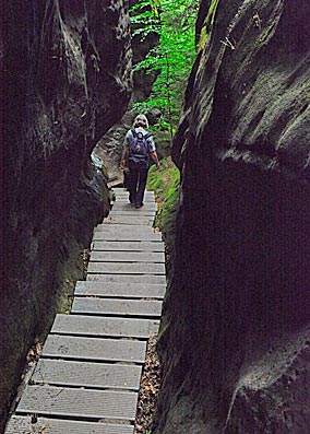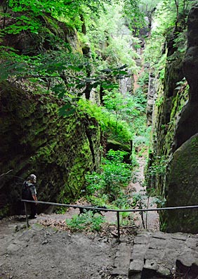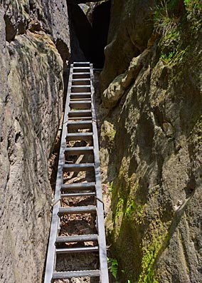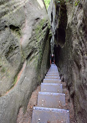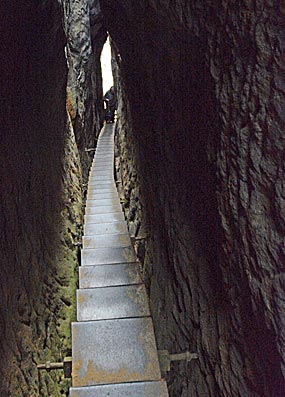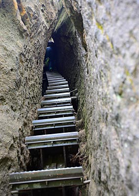 oder man steigt über eine ausgesprochen steile Stiege durch eine sehr enge, dunkle Felsspalte zum Hermannseck auf.