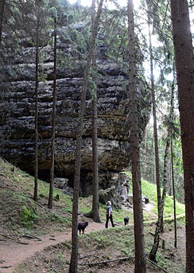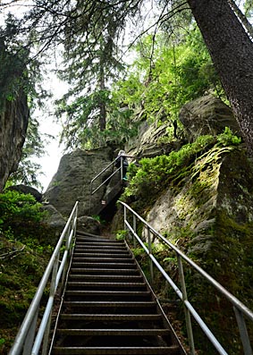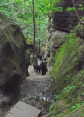 Der Abstieg erfolgt auf der anderen Seite des Felsens über eine Treppe. Dieser Auf-/Abstieg (neben dem Gasthaus) ist für Hunde problemlos.