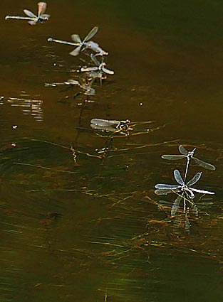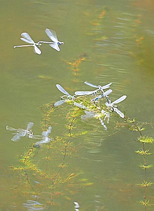 Über einem kleinen vom See abgetrennten Gewässer herrschte geschäftiges Treiben: Binsenjungfern (Lestes sponsa) bei der Eiablage