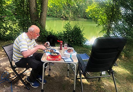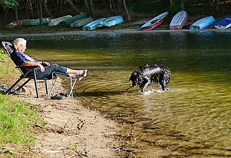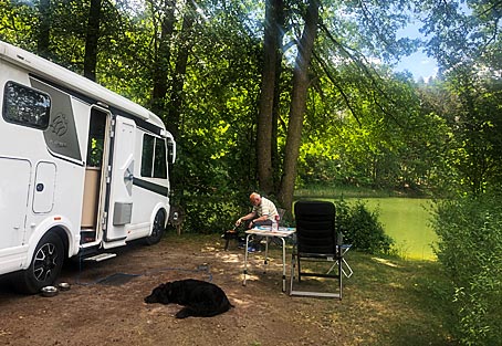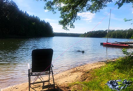 In der "Campingoase Waldsee" hatten wir einen tollen Stellplatz direkt am Langhagensee. Chili hat gleich die schöne Hundebadestelle inspiziert.