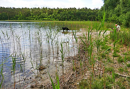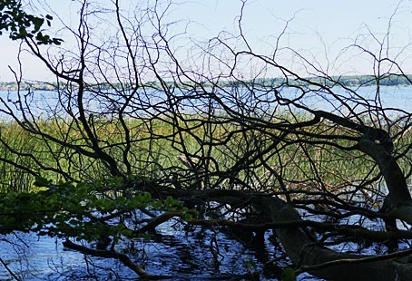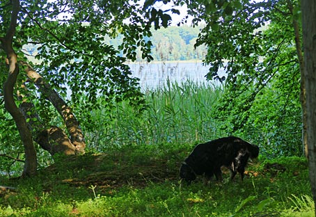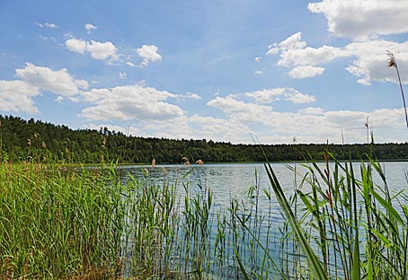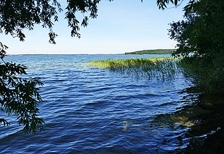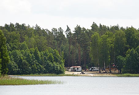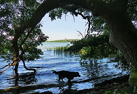Blick über den Großen Langhagensee zur Hundebadestelle des Campingplatzes. Der See ist max. 6 m tief.