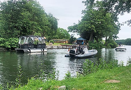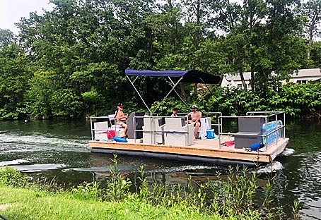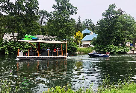 Man sieht viele Floßboote mit den ungewöhnlichsten Aufbauten. Hier z.B. zwei Floßboote mit Sitzgruppe