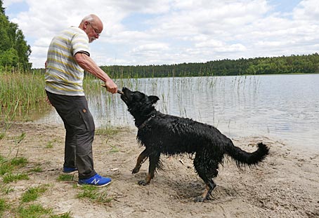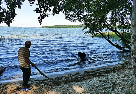 Zu unserem Stellplatz gehörte auch ein schmaler Sandstrand. Chili konnte nach Herzenslust schwimmen.